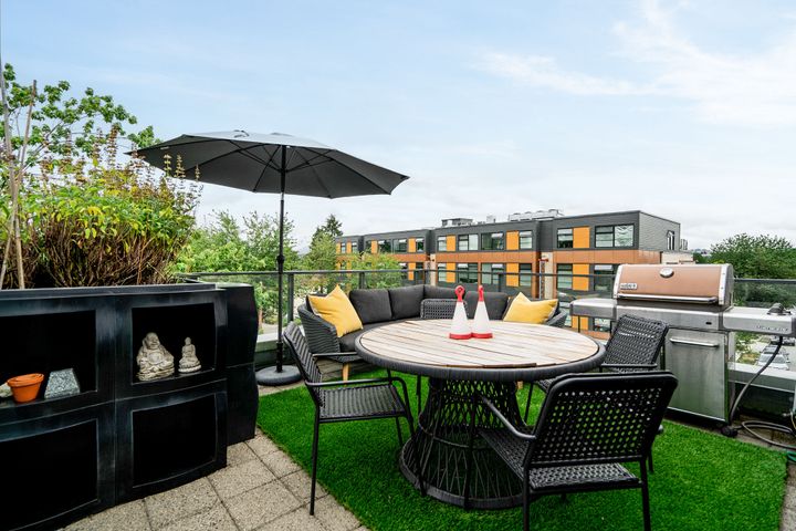 Patio living! Bright and spacious, this 3-bedroom townhome features a nearly 200 sf rooftop patio to enjoy summer living in the heart of the vibrant Commercial Drive/ Hastings neighbourhood. This open concept corner home is full of natural light and boasts a contemporary design featuring clean lines, natural wood flooring, sleek lacquered cabinetry and polished quartz countertops. The integrated appliance package blends seamlessly with the minimalist oak cabinetry in the Italian inspired kitchen. The ample living space is nicely set apart from the relaxing main floor bath (w/ deep soaker tub) and sizable secondary bedroom. Upstairs is the principal bedroom w/ ensuite bath, as well as the third bedroom and patio access. With its own private access, you are just steps to Templeton school (and park), Bosa Foods, Via Tevere, Pepinos, Caffe La Tanna and all of the conveniences of Commercial Drive and the East Village. Pets and rentals allowed, secure parking and a storage locker.