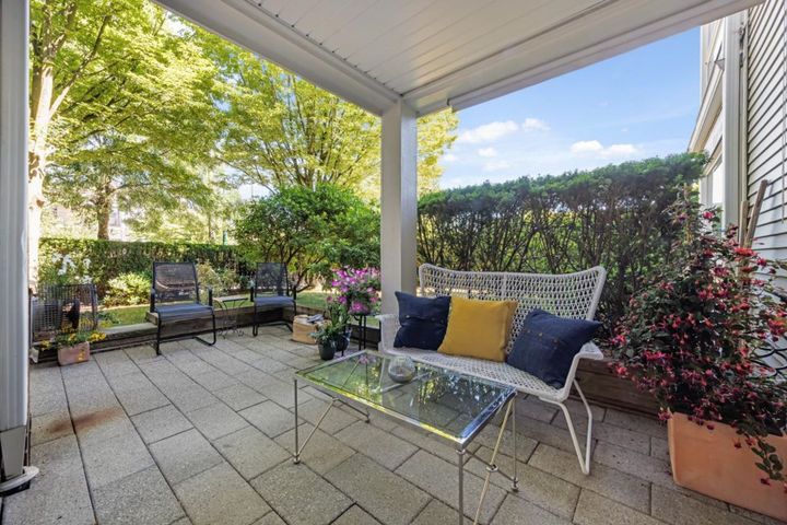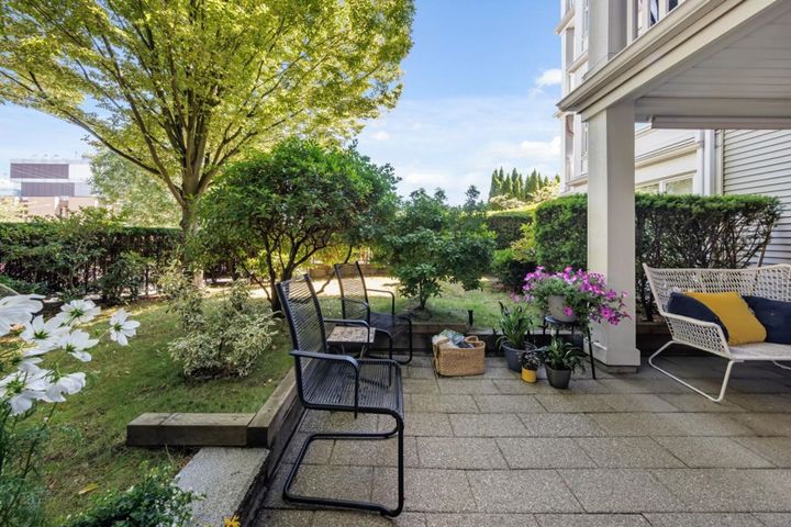 MUST LOVE DOGS OR GARDENING OR BOTH! AMAZINGLY SPACIOUS INDOOR/OUTDOOR LIVING IN THIS CORNER HOME AT THE FABULOUS "GREENWICH" IN KITS! INDOOR - Super open layout features large living dining room + fully open kitchen. Newer appliances include gas range + Miele dishwasher. Corian counters. King size bedroom + walk through closet to semi en suite bathroom. Spacious den. OUTDOOR - Dog heaven! Gated entry brings you through the 950sf garden (CP) onto your own 187sf private patio (LCP). THE BUILDING - simply the best! Ground breaking construction + beautiful architecture. Exceptionally well maintained. 2 pets + rentals ok (30 day min). Peaceful setting steps to Arbutus Greenway, Fifth Avenue Cinema & endless shops/restaurants. Under 15 mins walk to the Sea Wall, Granville Island & Kits Beach.
