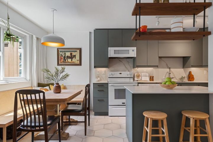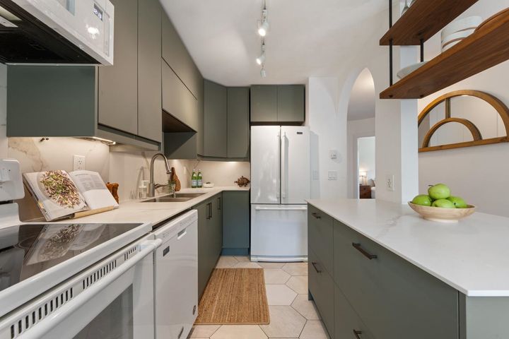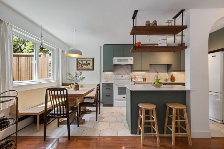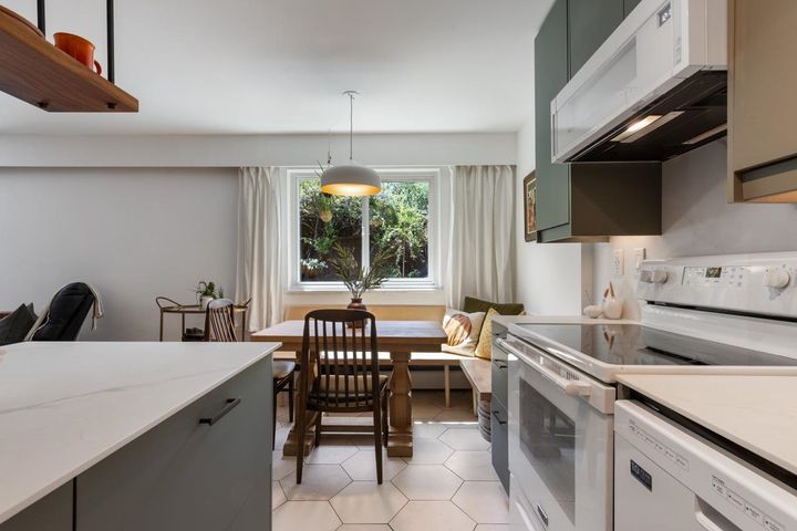 The Secret Garden in the Picasso. This updated home w/ a private wrap-around patio & access to a “hidden” yard space is situated in the heart of Mount Pleasant. A full reno brings a fresh feel to the kitchen & bath, w/ elevated details & quality finishes throughout. A spacious living area flows into the dining where a custom banquette offers the perfect spot for meals. Masterfully designed space allows both bdrms to be spacious, w/o detracting from living space- a unique find in condo living. The open-concept layout makes indoor/ outdoor living seamless w/ sliding doors opening onto the expansive patio- a rare find in the city. A short stroll to green space & views at China Creek Park w/ bike routes, transit, cafes & shops close by. *OH Thurs June 10 4:30-6:30PM, Sat/Sun July 12/13 2-4pm*